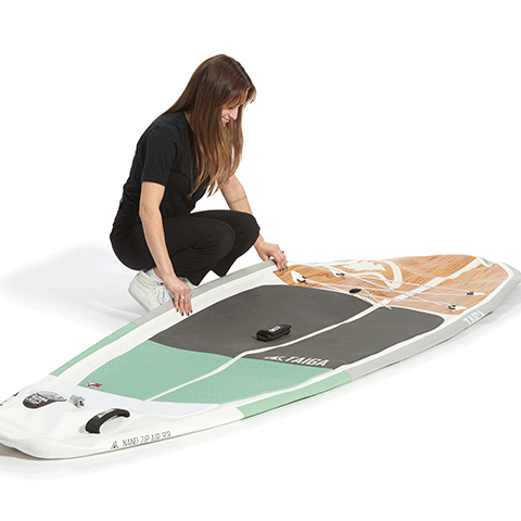Introducing our Zip Air Tech, a technology we've developed for the Nano Zip Air which allows it to fold in half on itself before being rolled. When packed in its bag with its pump, paddle, and fins, the Nano Zip Air measures 22" x 18" x 12", making it 50% smaller and more compact than a traditional inflatable board, resembling the size of a carry-on bag.