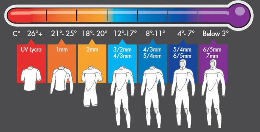 La température de l'eau influence considérablement le wetsuit qu'il te faut. Plus l'eau est froide, plus il te faudra une combinaison dont la couche de Néoprène est épaisse. Si le wetsuit indique un seul numéro (ex. 3mm), c'est que la couche de Néoprène est d'une épaisseur de 3mm partout sur la combinaison. À l'inverse, si le wetsuit est un 3/2, ceci signifie qu'il est de 3mm sur la zone du tronc pour assurer chaleur et flottabilité, et 2mm au niveau des bras et des jambes pour faciliter les mouvements.